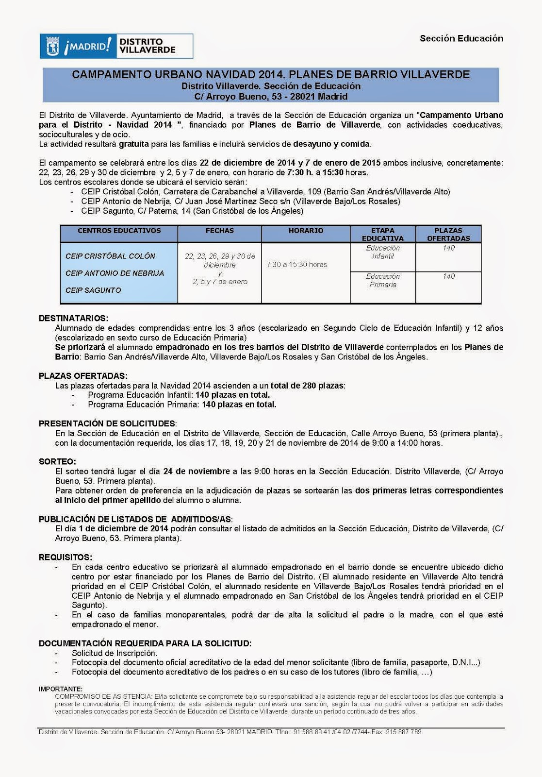 Se amplia el plazo de presentación de solicitudes de los Campamentos Urbanos de Navidad 2014, durante la última semana de noviembre: Días 24, 25, 26, 27 y 28 de noviembre de 2014 de 9:00 a 14:00 horas, en el Distrito de Villaverde, Sección de Educación, Calle Arroyo Bueno, 53 (primera planta).